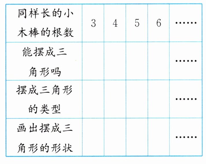 ①用3根同样长的小木棒能摆成一个三角形吗?若能,摆成的三角形是什么形状?