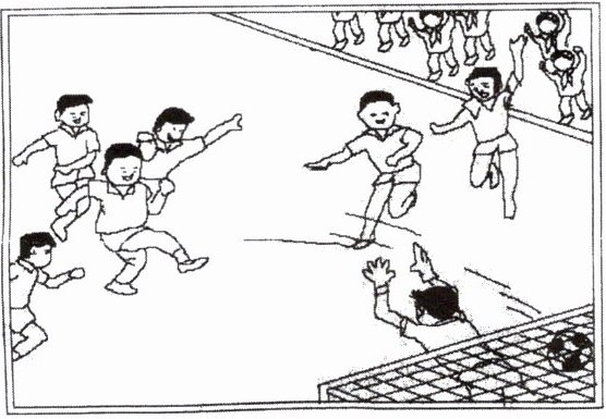 图中是一场精彩的足球比赛。球员们在球场上奋力奔跑,有的在积极进攻,试图射门。守门员也全神贯注,准备随时扑救。场边还有同学在欢呼加油,整个场景充满了活力与激情。大家都沉浸在这场足球比赛中,享受着运动带来的快乐。