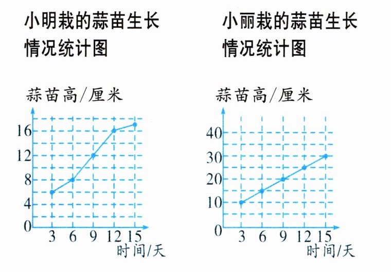 (2) 小明的统计图中,纵轴相邻两个数相差$4 - 0 = 4$,一小格表示$2$厘米($4÷2 = 2$);小丽的统计图中,纵轴相邻两个数相差$10 - 0 = 10$,一小格表示$5$厘米($10÷2 = 5$)。