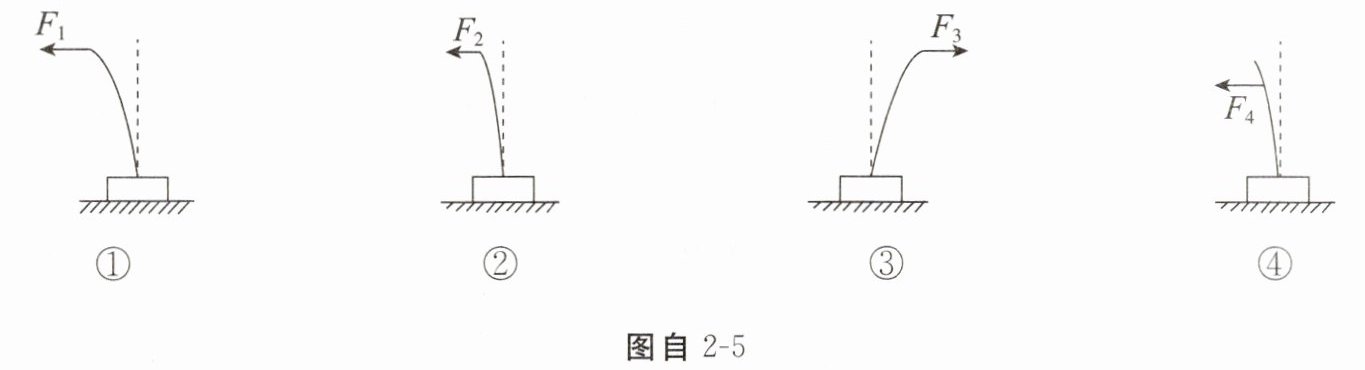 8. 如图自2-5所示,使一薄钢条的下端固定,现分别用不同的力去推它,使其发生如图①②③④所示的形变,如果$F_{1}= F_{3}= F_{4}>F_{2}$,那么能说明力的作用效果与力的作用点有关的图是()。