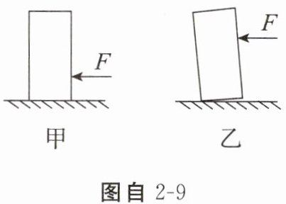 12. 如图自2-9甲所示,静止在水平面上的长方体木块,在水平推力F作用下向前移动,说明力可以改变物体的____;仅改变推力F作用的位置,如图乙所示,木块却向前倾倒,说明力的作用效果与力的____有关。