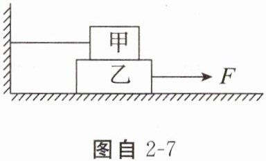 10. 如图自2-7所示,在光滑的水平面上叠放着甲、乙两个木块,木块甲用一根细绳拴在左边固定的竖直板上。现在用力把木块乙从右端匀速地抽出来,所用的力$F= 15N$,则甲、乙两木块所受的摩擦力是()。