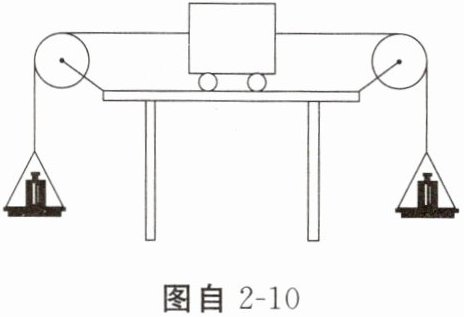 14. 如图自2-10所示,把小车放在水平桌面上,向挂在小车两端的托盘里加相同砝码,小车处于静止状态,那么小车对桌面的压力与____力是一对相互作用力,小车受到的重力与____力是一对平衡力。