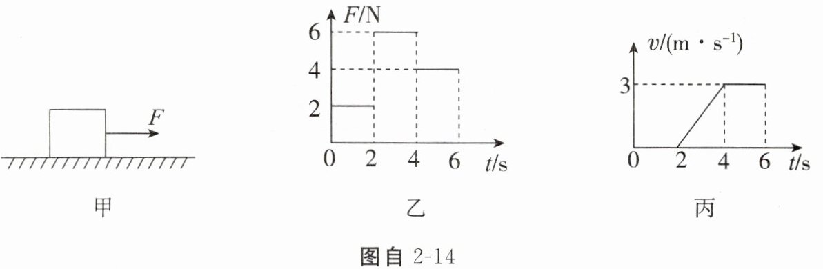 20. 如图自2-14甲所示,物体放在粗糙程度不变的水平地面上,用方向不变的力F向右拉物体,拉力F的大小随时间的变化关系如图乙所示,物体的运动速度随时间的变化关系如图丙所示。$t= 1s$时,物体受到的摩擦力为____N;$t= 3s$时,物体受到的摩擦力为____N。