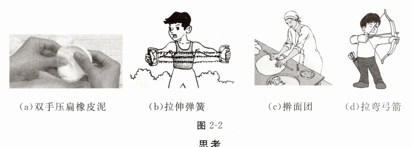 1. 如图$2 - 2$所示,这几张图示中内容的共同特征:他们都用力改变了物体的______。根据各图的不同特征进行分类:(b)(d)属于一类,共同特征是物体受力时发生______,撤去外力后,物体又会______。这类物体属于发生了______形变的物体。(a)(c)属于一类,共同特征是形变后不能自动______。这类物体属于发生了______形变的物体。