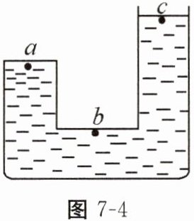 2. 如图7-4所示,盛水容器中有a、b、c三点,在这三点处,液体产生的压强分别为$p_{a}$、$p_{b}$、$p_{c}$,三者比较,最大的是____,最小的是____。