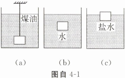 2. 娜娜将同一物体放在不同液体中的三种情况如图自4-1所示,比较它受到的浮力大小,其中浮力最小的是()。