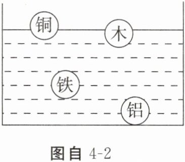 4. 体积相同的铜、铁、铝、木四个小球,放入水中静止后的浮沉情况如图自4-2所示,其中铝球对容器底部有压力。已知$ρ_{铜}>ρ_{铁}>ρ_{铝}>ρ_{木}$,下列判断正确的是()。