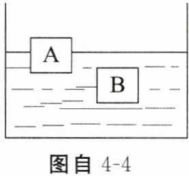 13. 有两个体积相同的物块A和B,静止在水中的情况如图自4-4所示,请你比较下列各物理量的大小。(均选填“<”“>”或“=”)