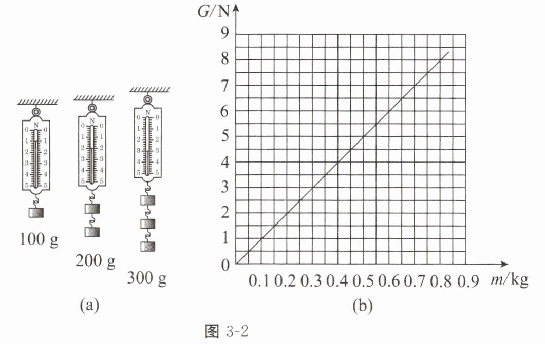 重力的大小与哪些因素有关呢?我们可以用弹簧测力计来测量重力,根据测出的重力数值,我们就能画出重力—质量图像(图3-2b)。