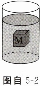 4. 如图自5-2所示,装有水的容器静止放在水平桌面上,正方体物块M悬浮在水中,其上表面与水面平行,下列说法正确的是()。