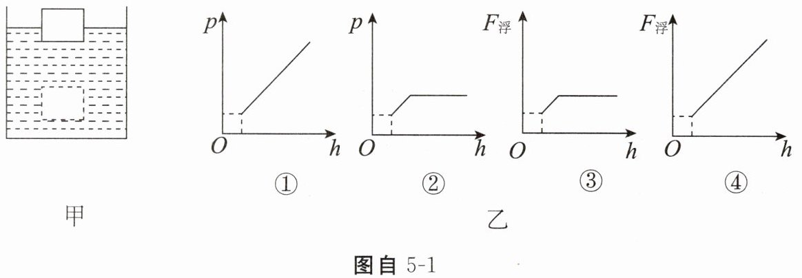 3. 一物体(长方体)漂浮在水面上,如图自5-1甲所示,对物体施加力的作用,使物体下降至图自5-1甲中的虚线位置。已知物体的下表面到水面的距离为h,水对物体下表面的压强为p,物体受到的浮力为$F_{浮}$,图自5-1乙中,p、$F_{浮}$与h的关系正确的是()。