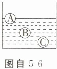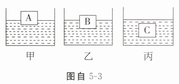5. 如图自5-3所示,放在水平桌面上的三个完全相同的容器内装有适量的水,将A、B、C三个体积相同的正方体分别放入容器内,待正方体静止后,三个容器内水面高度相同。下列说法正确的是()。