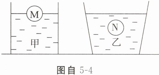 6. 水平桌面上两个底面积相同的容器中,分别盛有甲、乙两种液体。将两个完全相同的小球M、N分别放入两个容器中,静止时两球状态如图自5-4所示,两容器内液面相平。下列分析正确的是()。