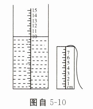 15. 如图自5-10所示,有一柱状的薄透明玻璃容器(在它的外面有表示高度的刻度纸)和一底面积是$20cm^{2}$、高8cm并刻有高度的圆柱体(密度大于水的密度,用细线系着)。某实验小组利用这两个器材探究:当物体浸入柱状容器的水中时,水对容器底增大的压强与水对物体的浮力之间有什么关系?
