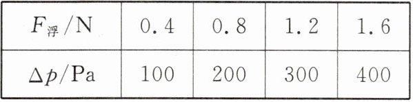 (1)分析表中数据可知,当圆柱体浸入柱状容器的水中时,水对容器底增大的压强与水对物体的浮力成____,如果物体浸没后继续增大它在水中的深度,$F_{浮}和\Delta p$都____(选填“增大”“不变”或“减小”)。