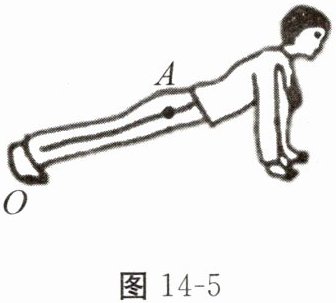 6.如图14-5所示,小明在做俯卧撑时可视为一个以脚为支点O的杠杆,如果他的重心在A点,请在图中画出重力G、支撑力F及支撑力的力臂l。