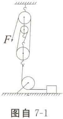 1. 娜娜利用如图自7-1所示的滑轮组拉一金属块在地面上以0.2m/s的速度匀速运动,若动滑轮重15N,金属块重75N,地面对金属块的摩擦力是金属块所受重力的$\frac {2}{5}$(不计绳重和轮与轴之间的摩擦),则拉力F和它的功率P分别为()。