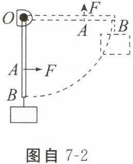 3. 如图自7-2所示,一直杆可绕O点转动,杆另一端挂一重物,为了提高重物,用一个始终与直杆垂直的力F使直杆由竖直位置慢慢转动到水平位置,在这个过程中()。