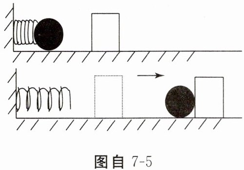 (1)为验证其猜想是否正确,他设计了如下实验(弹簧被压缩后未超过其弹性限度):如图自7-5所示,将同一个弹簧压缩______(选填“相同”或“不同”)的长度,将小球置于弹簧的右端,松开后小球碰到同一位置的相同木块上,分析比较木块______,从而比较弹性势能的大小。