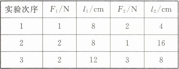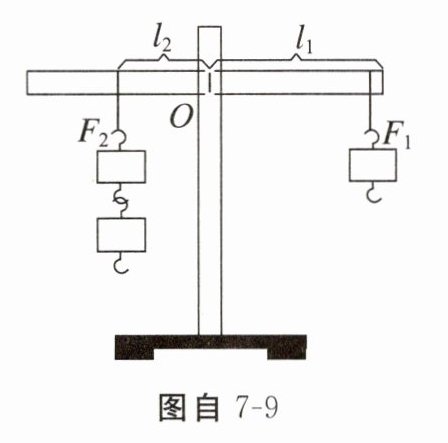 (1)小明调节杠杆在水平位置平衡后,按图自7-9所示,通过加挂钩码分别改变$F_{1}$、$F_{2}$,仍使杠杆在水平位置平衡,并用刻度尺在杠杆上测出对应的$l_{1}和l_{2}$,记录的实验数据如表。