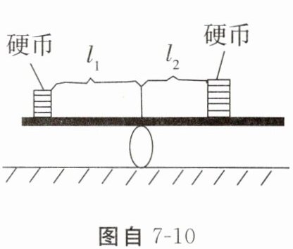 (2)某同学利用身边的塑料直尺和若干硬币来验证杠杆平衡的条件,如图自7-10所示,当杠杆在水平位置平衡时,他测出从支点到硬币边缘的距离作为力臂$l_{1}和l_{2}$的大小。他测力臂的方法是______(选填“正确”或“错误”)的。如果将两边的硬币以大小相同的速度同时匀速向支点移动,则杠杆______(选填“仍平衡”“向左倾斜”或“向右倾斜”)。