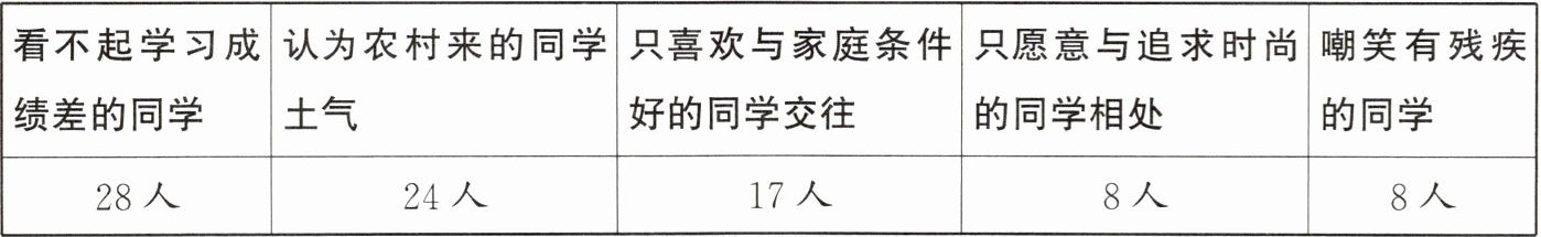 13. 某校八年级(3)班的同学最近在班内组织了一次调查实践活动,主题是“中学生中存在的歧视他人状况调查”。下表是调查结果:
