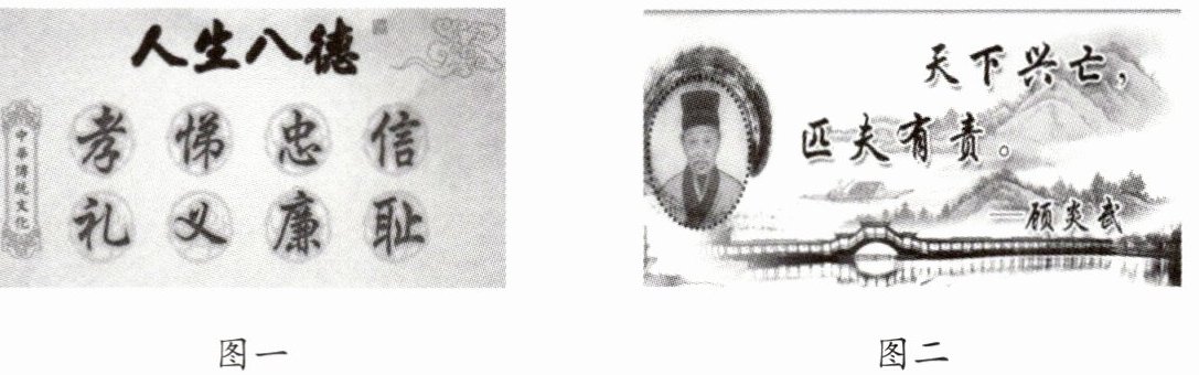 (1)图一。推荐理由:孝悌忠信、礼义廉耻的荣辱观念。判断一切是非、善恶、荣辱,都需要明确的标准。“由义为荣,背义为辱。”中华民族一贯以遵守道德为荣,以违背道德为耻。这一荣辱观念渗透在生活的方方面面,成为中国人日用而不觉的道德标准。