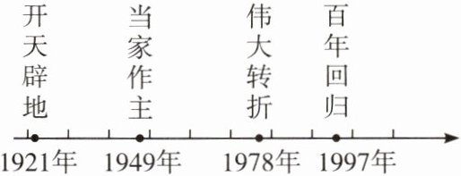 (1)“开天辟地”:中共一大召开;(或中国共产党成立)“当家作主”:中华人民共和国成立;“伟大转折”:中共十一届三中全会召开;“百年回归”:1997 年 7 月 1 日香港回归祖国。
