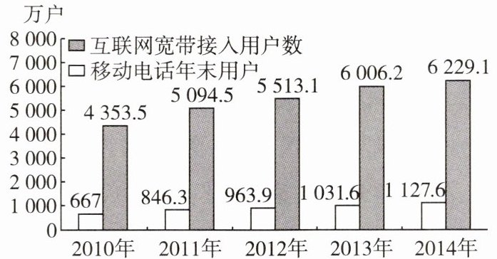 材料二 我国互联网宽带接入用户数和移动电话年末用户变化示意图