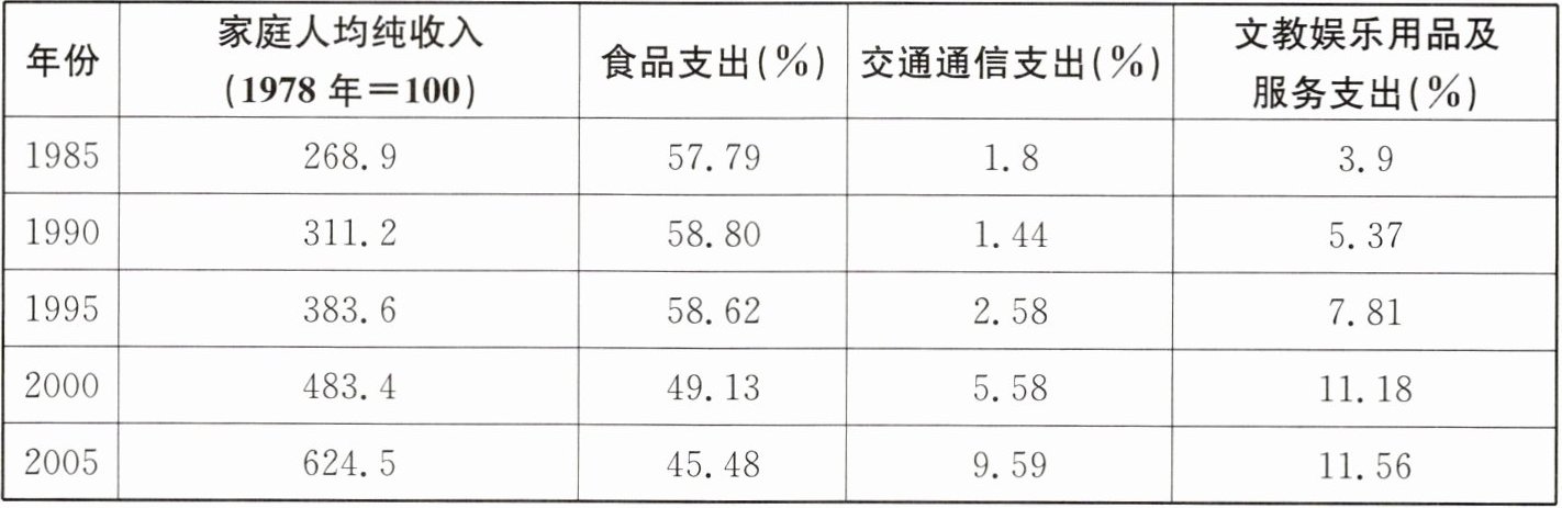 (1)趋势和特点:农民收入不断增加,消费支出不断增加,消费呈现出多元化特点。原因:改革开放以来我国农村实行家庭联产承包责任制,调动了农民生产积极性,增加了农民收入;乡镇企业的发展,成为农民致富的重要途径;随着农村经济的发展,农民的生活水平大幅度提高。