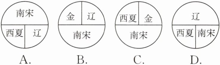 2. 中华民族的历史是由各族人民共同缔造的,各民族之间有分有和,在交流与碰撞中不断地交融。两宋时期,曾出现了宋与辽、西夏、金几个政权并立的局面。下列能正确反映南宋与民族政权并立的示意图是(
