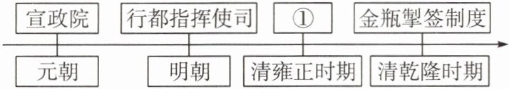 1. 元明清时期,统一多民族国家得到进一步的巩固和发展。下图展示的是这一时期中央政府对西藏地区加强管辖的历史脉络。其中①处应是(