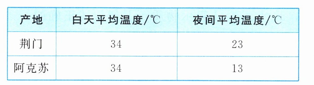 9. 新疆维吾尔自治区的阿克苏冰糖心苹果味甜多汁,皮薄肉厚,含糖量高,有人把这种苹果引到湖北省荆门市种植,结出的苹果品质却不同。在果树生长期间,两地光照条件和管理措施相同,但昼夜温度有一定差异(如下表)。经测定,新疆维吾尔自治区产的阿克苏冰糖心苹果的含糖量明显高于湖北省荆门市产的苹果的含糖量,对此解释正确的是(