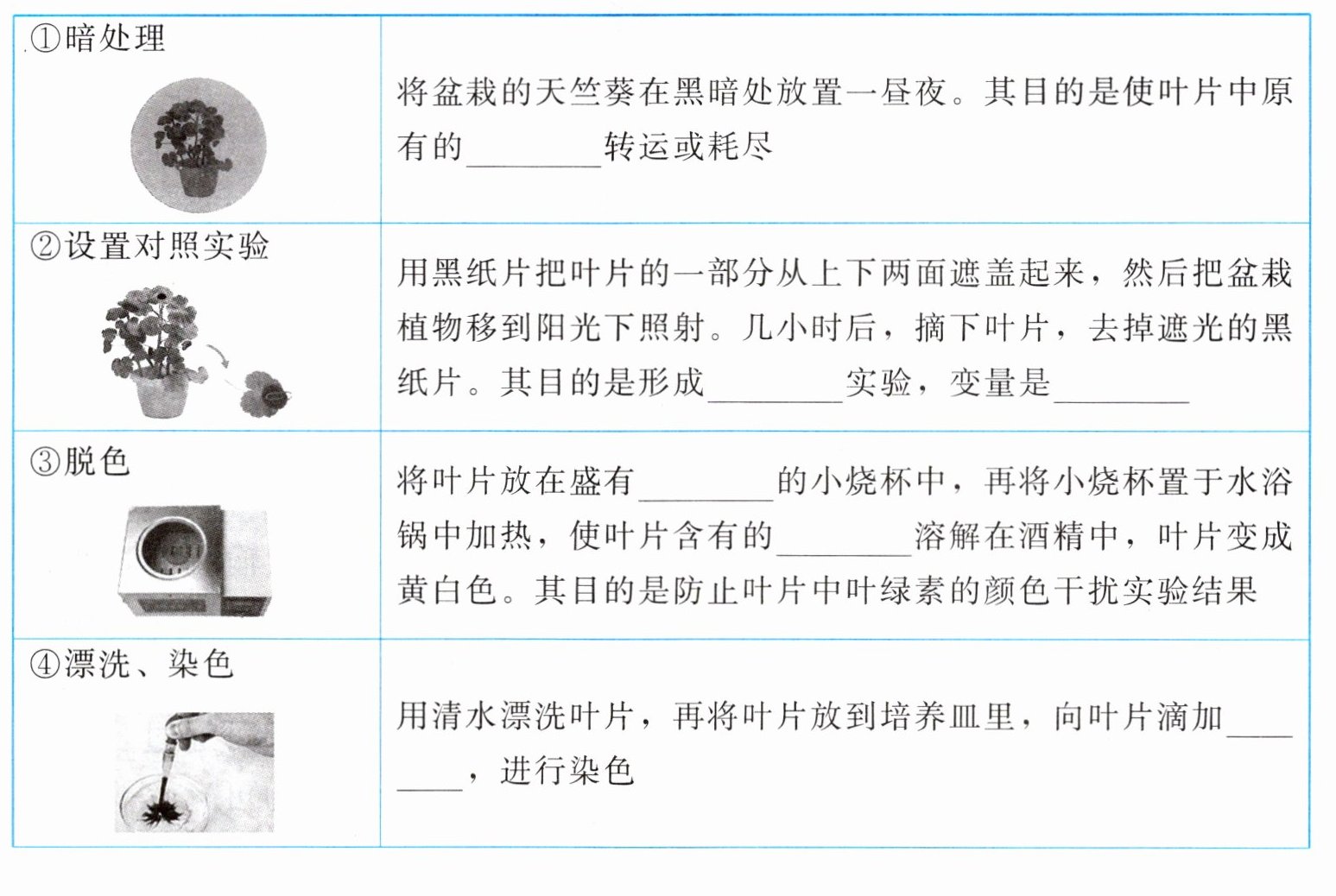 (1) ①淀粉(或有机物) ②对照 光 ③酒精 叶绿素 ④碘液 ⑤变蓝 不变蓝