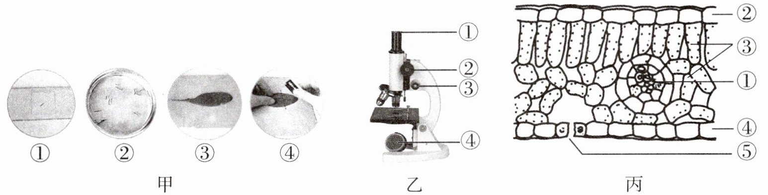 8. 生物学是自然科学中的一门基础学科,是研究生命现象和生命活动规律的科学。探究和实践是学习生物学的重要方式,有利于提升科学素养。图甲为制作叶片横切面临时切片实验过程图,图乙是显微镜结构示意图,图丙是叶片横切面结构示意图,请据图回答下列问题。