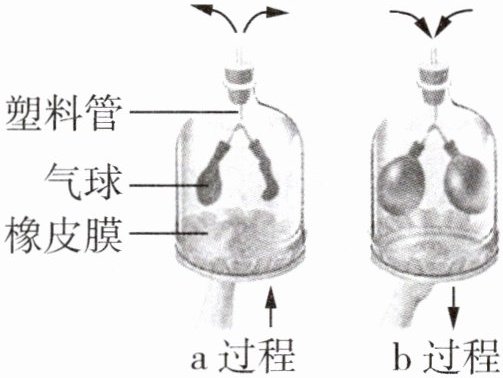 8. 模型可直观地表示相应的结构和功能。同学们运用跨学科知识,选择恰当的材料,设计制作了模拟人体吸气和呼气过程的模型。他们向上推橡皮膜(a过程)再慢慢松手(b过程),观察气球容积的变化情况。下列关于这两个过程的分析,合理的是(