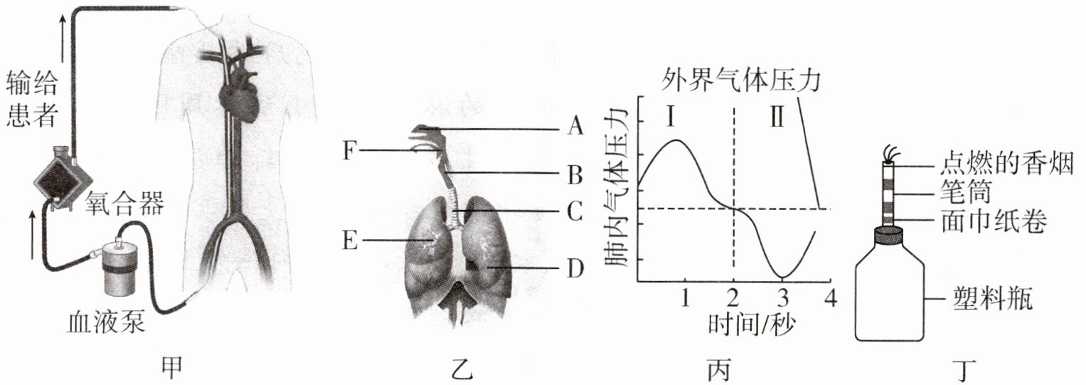 (5)吸烟有害健康,为了让同学们直观地认识吸烟对呼吸系统的危害,小欢利用塑料瓶和废签字笔等材料,制作了一个模拟吸烟的模型,如图丁所示。将香烟插入笔筒后点燃,多次挤压塑料瓶,模拟吸烟过程;烟燃尽后取下烟蒂,取出笔筒内的面巾纸卷,并展开;观察被烟雾污染后的笔筒、面巾纸卷和塑料瓶。模型中塑料瓶模拟呼吸系统的肺,当挤压塑料瓶时,模拟的是