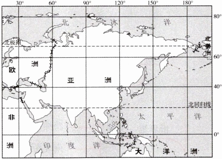 亚洲全称亚细亚洲,是世界第一大洲。读亚洲的位置和范围图,完成 1~2 题。