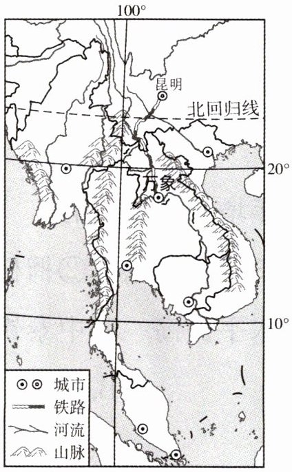 2024年春节期间,昆明海关共监管验放经中老铁路进出口的货运量达13万吨,货值3.45亿元。读中老铁路示意图,完成9~10题。