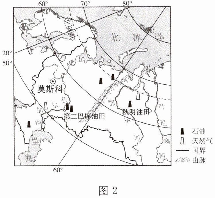 材料二 2024年5月16日,第八届中国—俄罗斯博览会在哈尔滨市启幕,本次博览会的主题为“合作、互信、机遇”。目前,中国是俄罗斯最大贸易伙伴国,俄罗斯已成为中国最大石油供应国。图2为俄罗斯主要油气田分布图。