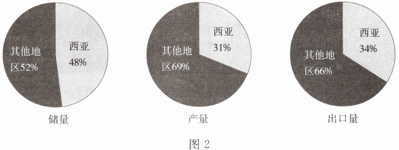 。(3)图2为西亚石油储量、产量和出口量占世界的比重图(2020年),据此说明西亚石油在世界的地位。