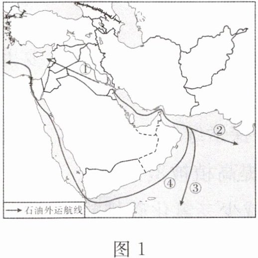 之间,战略位置极为重要。(2)某油轮在驶往中国的过程中,一般会选择图1中①一④路线中的
