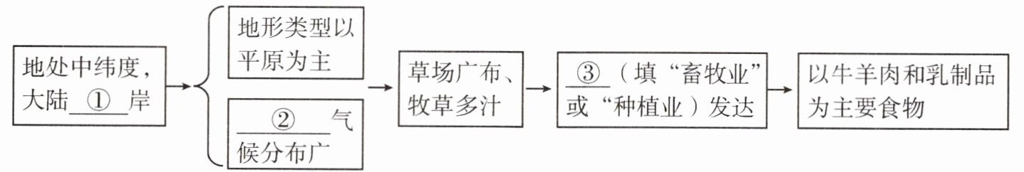 (填“冬季”或“夏季”)晴天多,阳光充足,加之沙滩广阔,形成海滨度假胜地。(4)美食是旅游中不可或缺的重要组成部分,欧洲西部的饮食习惯与当地自然环境有着密切关系,据此将下图中的内容补充完整。