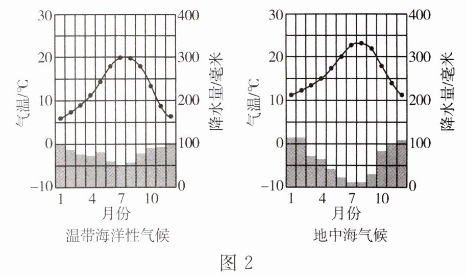 作为世界上旅游业最发达的地区之一,欧洲西部一直以独特的魅力吸引着世界各地的游客。下列图1为欧洲西部地形和气候类型分布图,图2为部分气候类型的多年平均各月气温曲线和降水量柱状图。