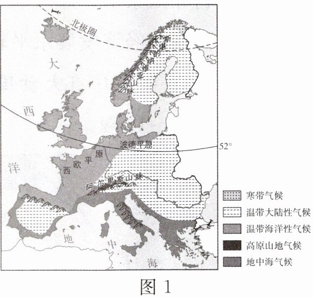 (1)欧洲西部的斯堪的纳维亚半岛,因纬度较
