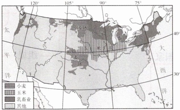 美国是世界上的农业强国,玉米、小麦、大豆、棉花等产量和出口量均居世界前列。读美国本土小麦、玉米、乳畜业的分布示意图,完成 1~3 题。