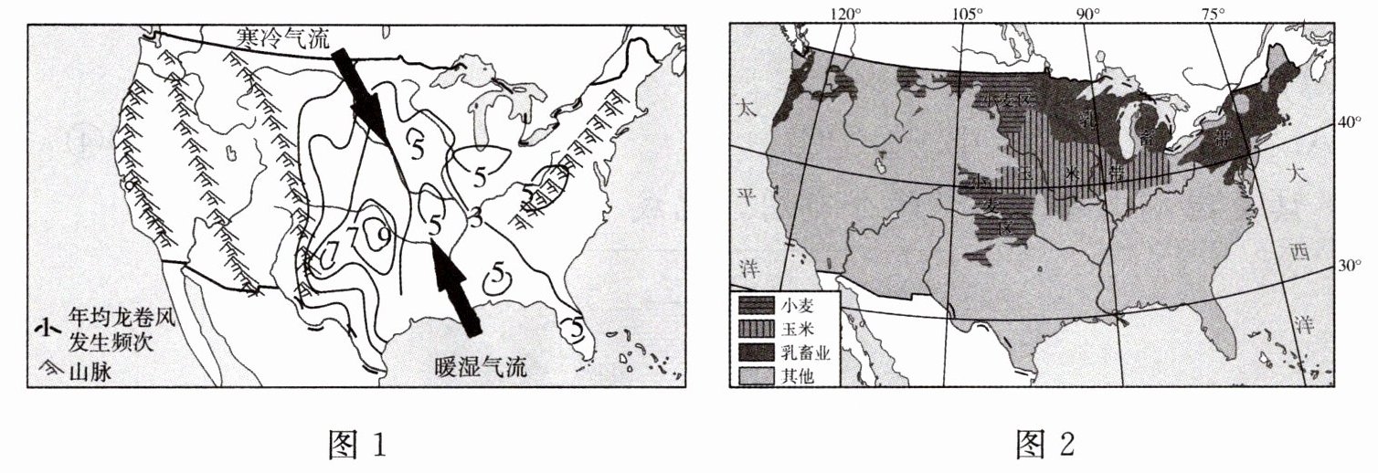 美国的龙卷风不仅数量多,而且强度大。下列图 1 为美国本土多年平均龙卷风发生频次图,图 2 为美国本土小麦、玉米、乳畜业的分布示意图。