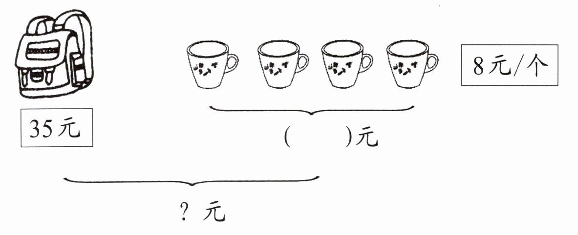 对于插图,$4$个杯子,每个$8$元,总价为$4×8 = 32$元;书包$35$元,书包和杯子总价为$35 + 32 = 67$元。