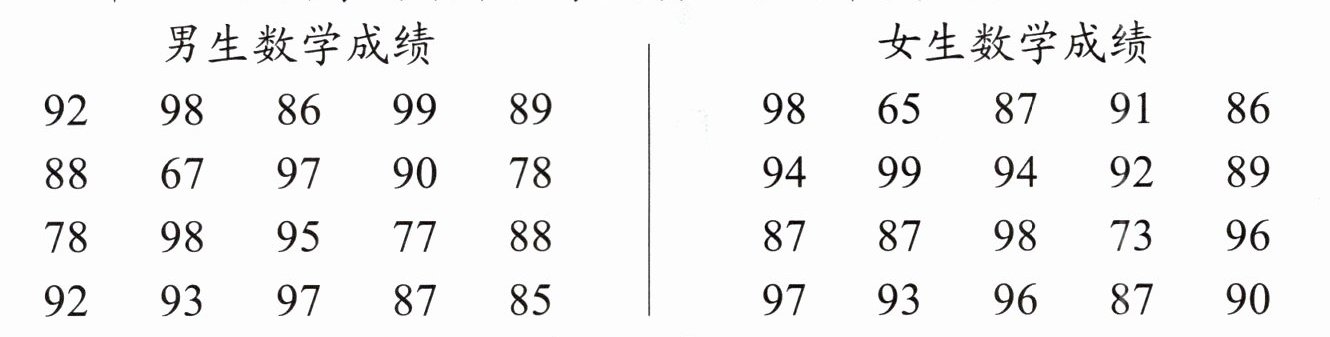 $\begin{array}{|c|c|c|c|c|} \hline \begin{array}{c} 人 \\ 数 \\ 性别 \end{array} & 90及90以上 & 80\sim89 & 70\sim79 & 60\sim69 \\ \hline 男生 &
